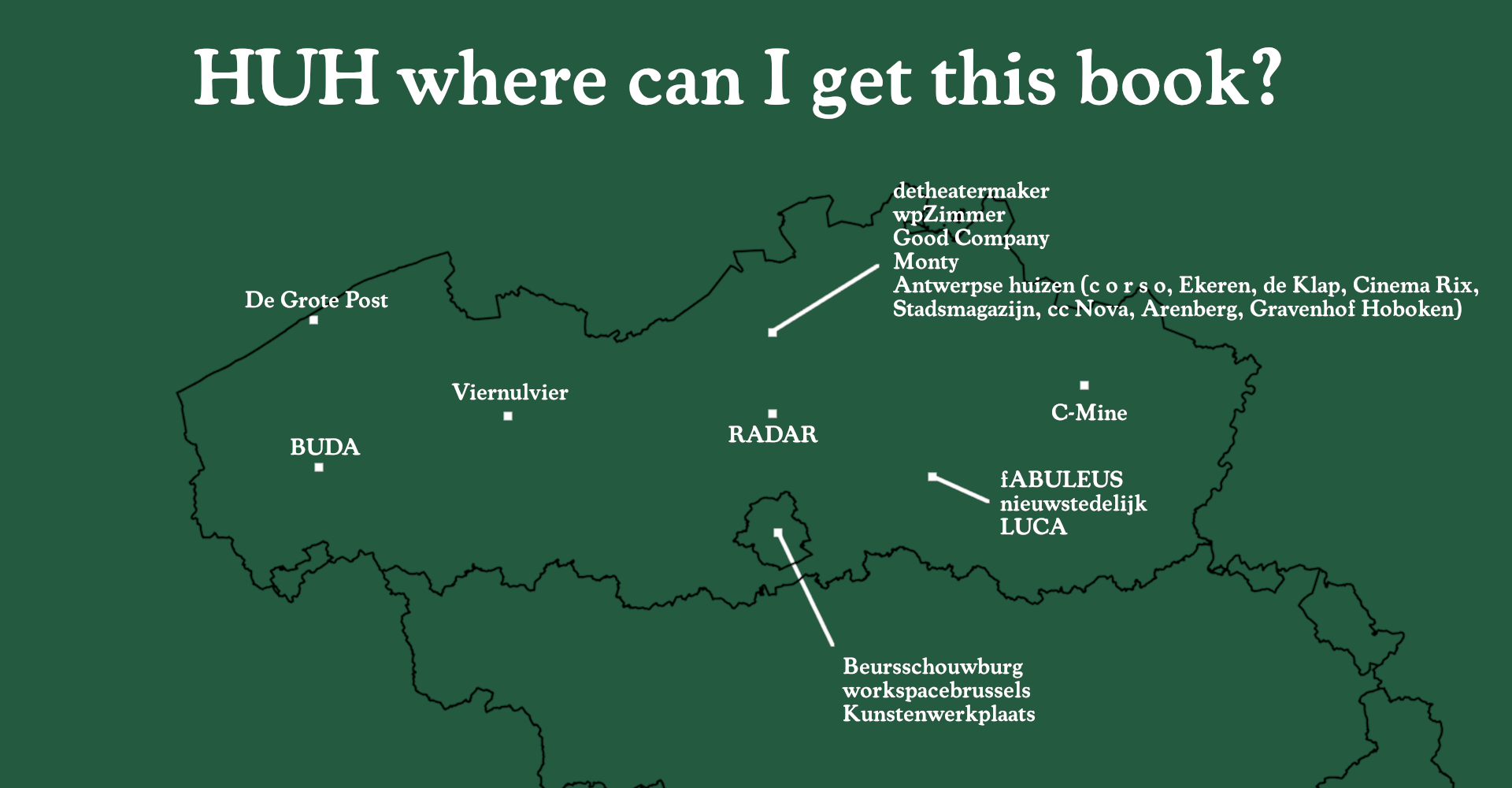 You can't, actually. We printed a 1000 books and they have all been bought by some very nice organisations, who will act as distribution points. KWP, Beursschouwburg and Viernulvier will just have them for sale at their reception desk, Monty will sell them at the ticket desk on nights of performances - all at a very democratic price! If you happen to have a coffee with one of the other places on the map, they will probably give you one for free. If at one point these spaces are out of stock, I will consider a reprint.